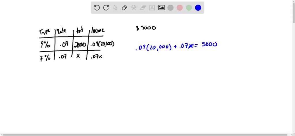 So this problem lays out everything pretty nicely for you in a little table. Have a lady who inherited some money and wants to invest so that she has an annual income of $5000. We need to figure out she's already invested $20,000 at 9%. We need to figure out how much she has to invest that 7% so that her total income is 5000. So we already know her income that her 9% investment is 90.9 times 20,000. We have an expression for her income at her 7% investments, and we simply need those two when added together to total 5000. So I need to just go ahead and solve for X. So I'm gonna do 0.9 times 20,000 and that equals 1800 plus 0.7 x $5000. Subtract 1800 from both sides minus 1800 means that 0.7 X has to equal 3200. And then I'm gonna divide by 0.7 Divide by 0.7 and let's see 3200 divided by a 32000.7 equals. Uh, we're gonna go ahead and round because it came out to a decimal. 45,000 $715 is how much she would have to invest at 7% for an annual income of $5000.